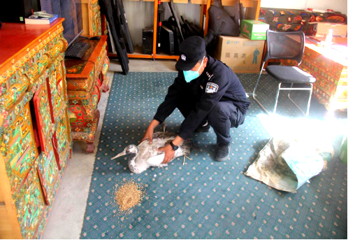 11月10日,拉孜县公安局曲玛乡派出所民警巡逻时,在达布村一路段水渠中发现一只受伤的黑颈鹤,左腿部受伤无法站立,与相关部门沟通,随后驱车将黑颈鹤送至县林业局进行专业救治。